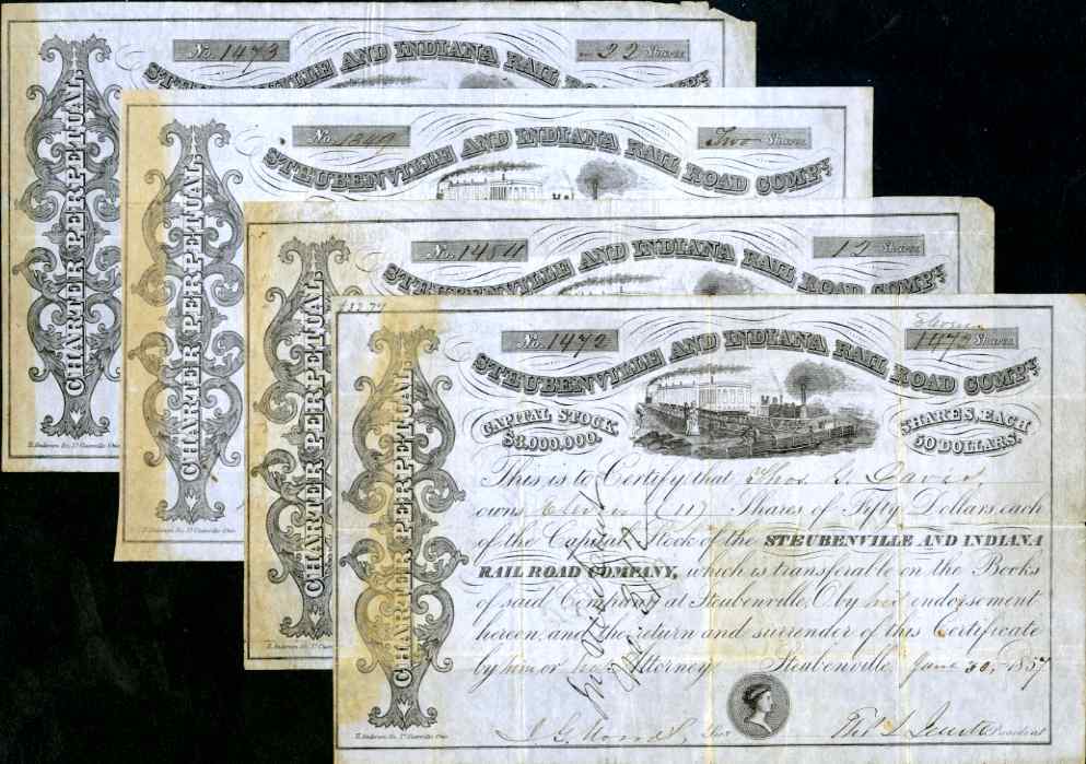 Wholesale lot of Four 1856-7 Steubenville & Indiana RR Stock Certificates